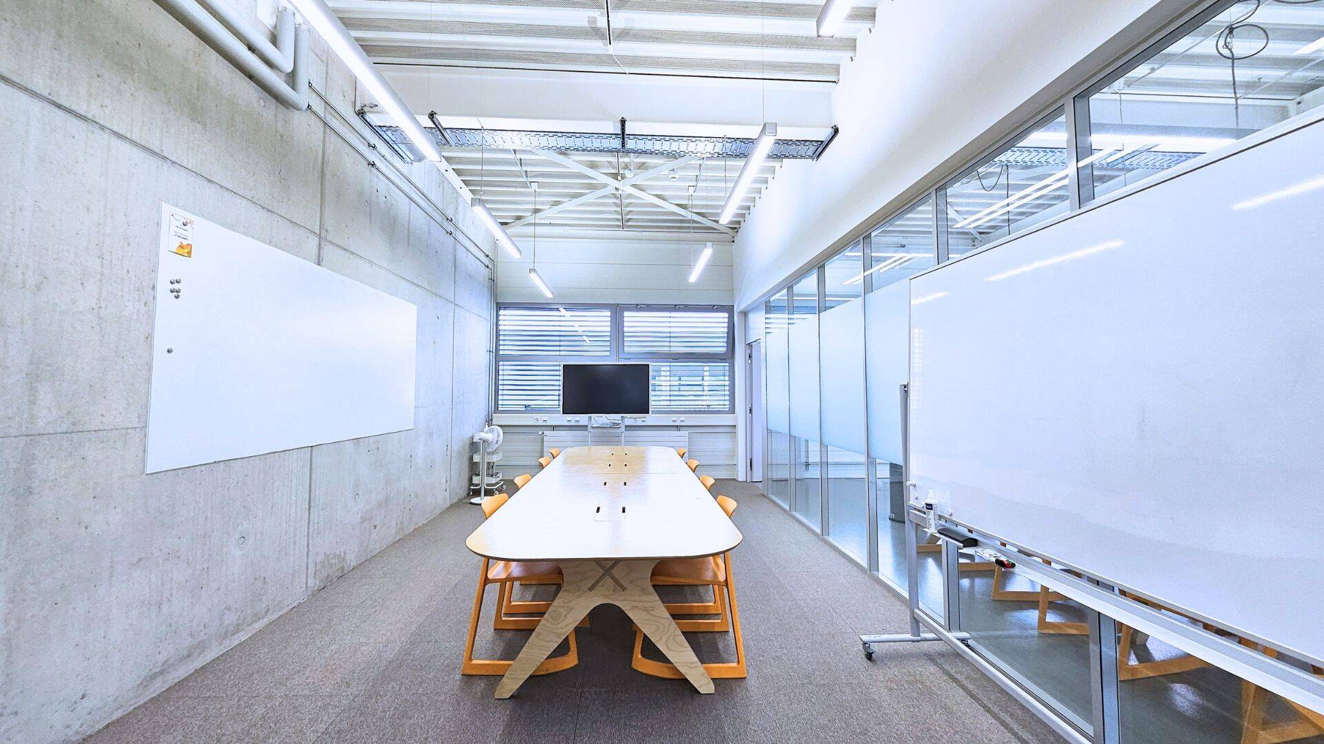 La salle de réunion n° 2 peut accueillir jusqu'à 12 personnes et est équipée d'une longue table, de chaises, d'un écran de télévision et d'un tableau blanc mural